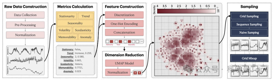 BLAST采用四阶段流程来构建平衡的时间序列预训练语料库,如图3所示。该方法的核心在于将传统基于数据集/领域标签的采样方式转变为基于数据模式特征的智能采样策略。