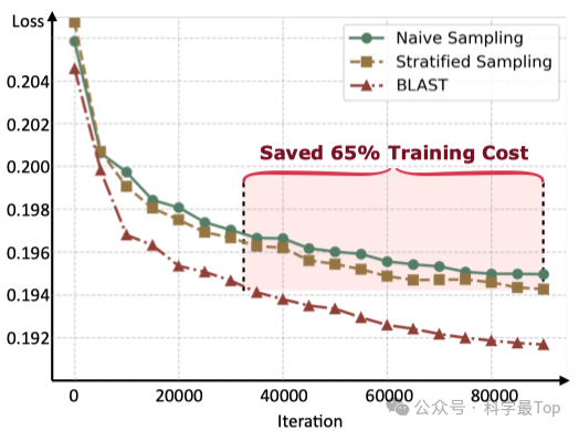 实验结果表明,BLAST方法在训练效率和模型性能方面均取得了显著提升。如下图所示,采用BLAST平衡采样策略的模型展现出更快的收敛速度和更低的验证损失。在训练后期阶段,平衡采样仅需约35%的训练步数即可达到与朴素采样或分层采样相当的损失水平,大幅提升了训练效率。