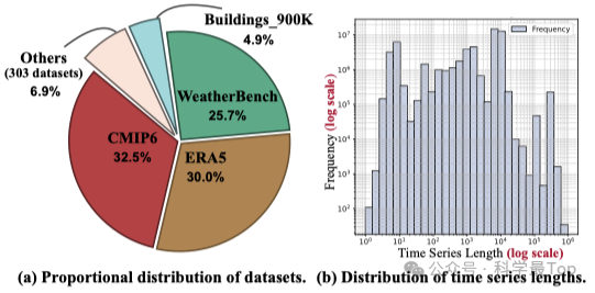 图2通过两个子图更直观地展示了原始数据的不平衡分布,图2(a)显示仅三个数据集就占据了总数据量的88.2%,显示出极端的数据集层面不平衡。图2(b)表明长序列倾向于贡献更多样本,导致序列长度层面的不平衡。这种偏斜分布会导致原始数据中出现大量重复模式,损害整体数据多样性。