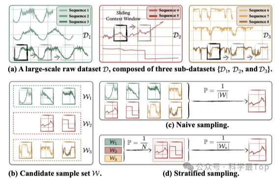 图1(c)和(d)进一步对比了两种常见但不完善的采样策略:朴素采样(Naive Sampling):从所有子数据集中均匀选择样本(图1c)分层采样(Stratified Sampling):先选择子数据集,再从子数据集中选择样本(图1d)。