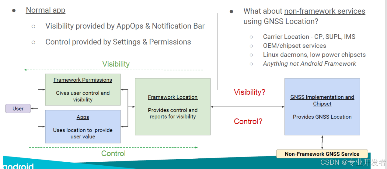 - 可见性由 AppOps(应用操作权限)与通知栏提供