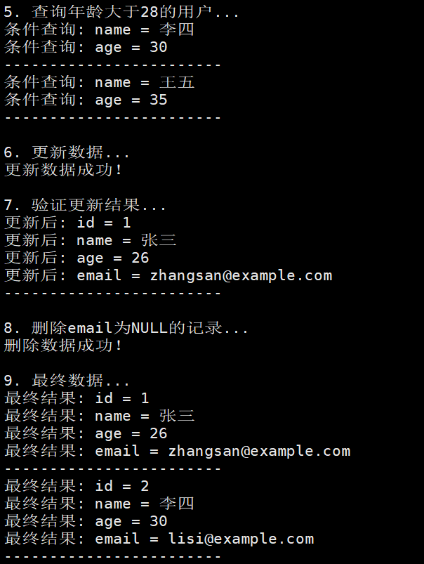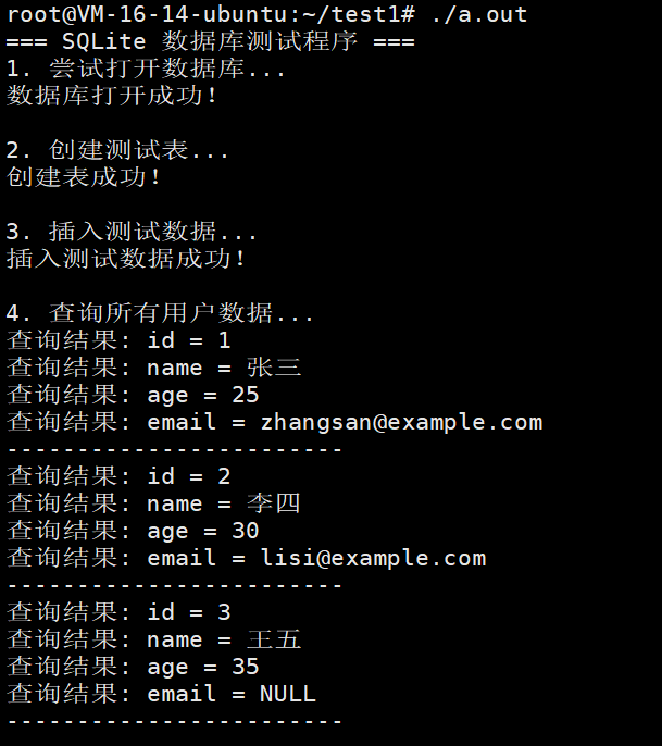 std::string insertSQL2 = "INSERT INTO users (name, age, email) VALUES ('李四', 30, 'lisi@example.com')";