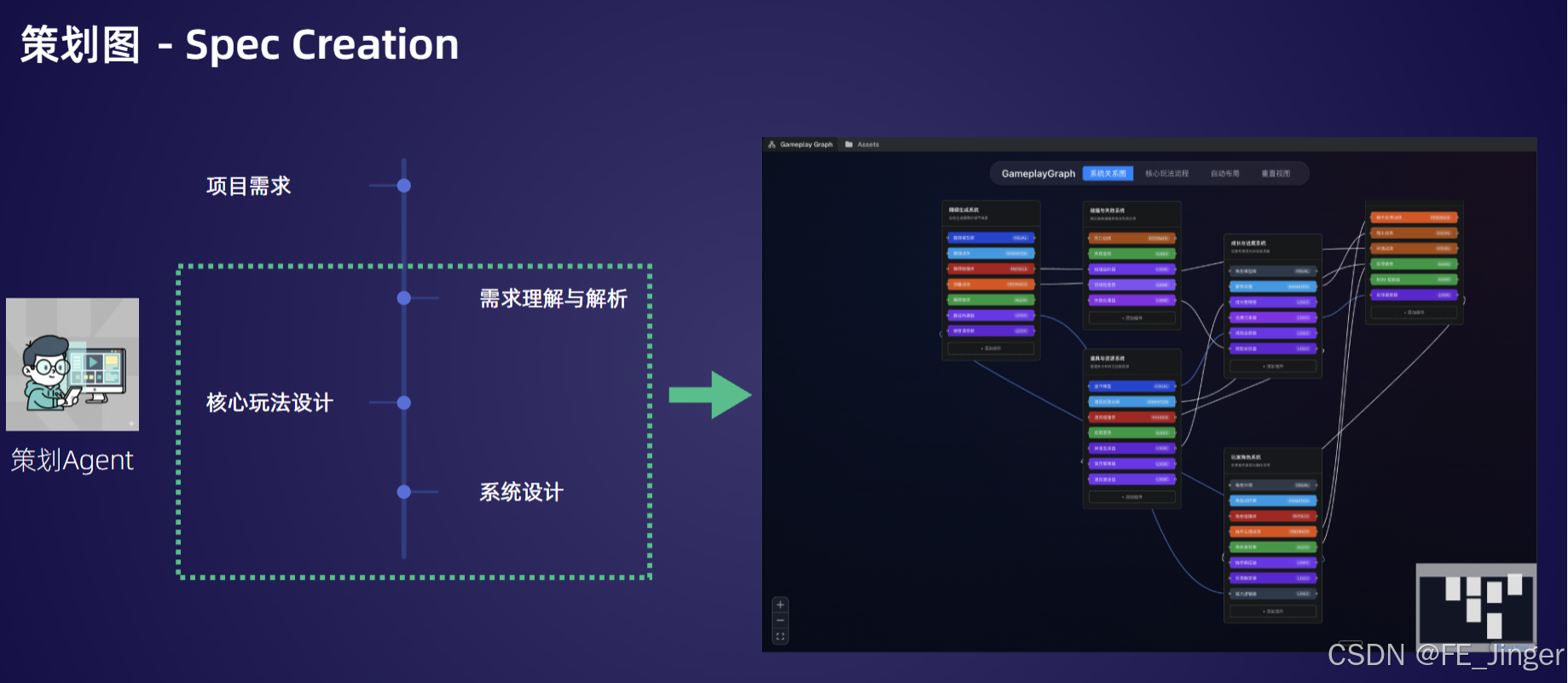 - 比如策划说"做一款跑酷游戏",策划Agent会自动拆解为"核心玩法设计(如跳跃避障)→ 系统设计(如积分规则)→ GameplayGraph流程图";
