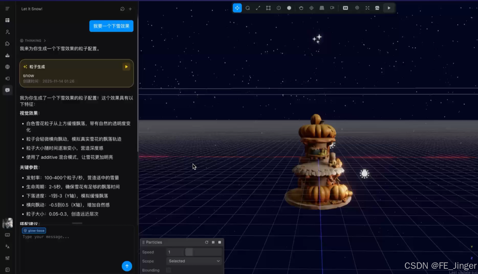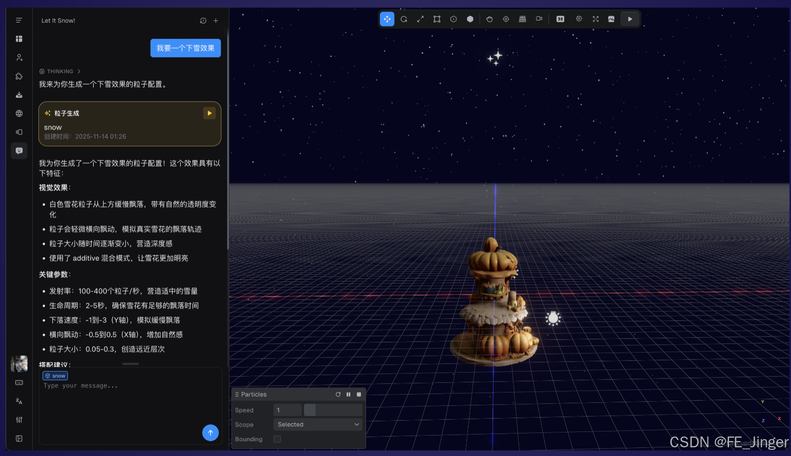 - 粒子Agent:专门生成火焰、雪花、烟雾等特效,懂3D粒子的物理参数和视觉逻辑;