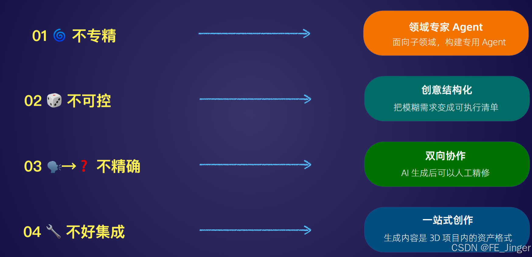 核心亮点:不再依赖"通用AI黑盒",而是用"专业分工+协作流程",解决3D开发的四大核心痛点(不专精、不可控、不精确、不好集成)。