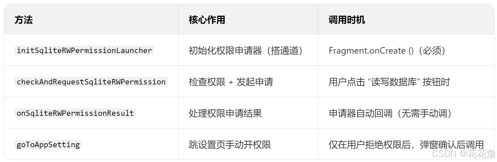 initSqliteRWPermissionLauncher()→ 仅初始化权限申请器 (注册 "申请权限→接收结果" 的通道),不获取任何权限值;- 当调用