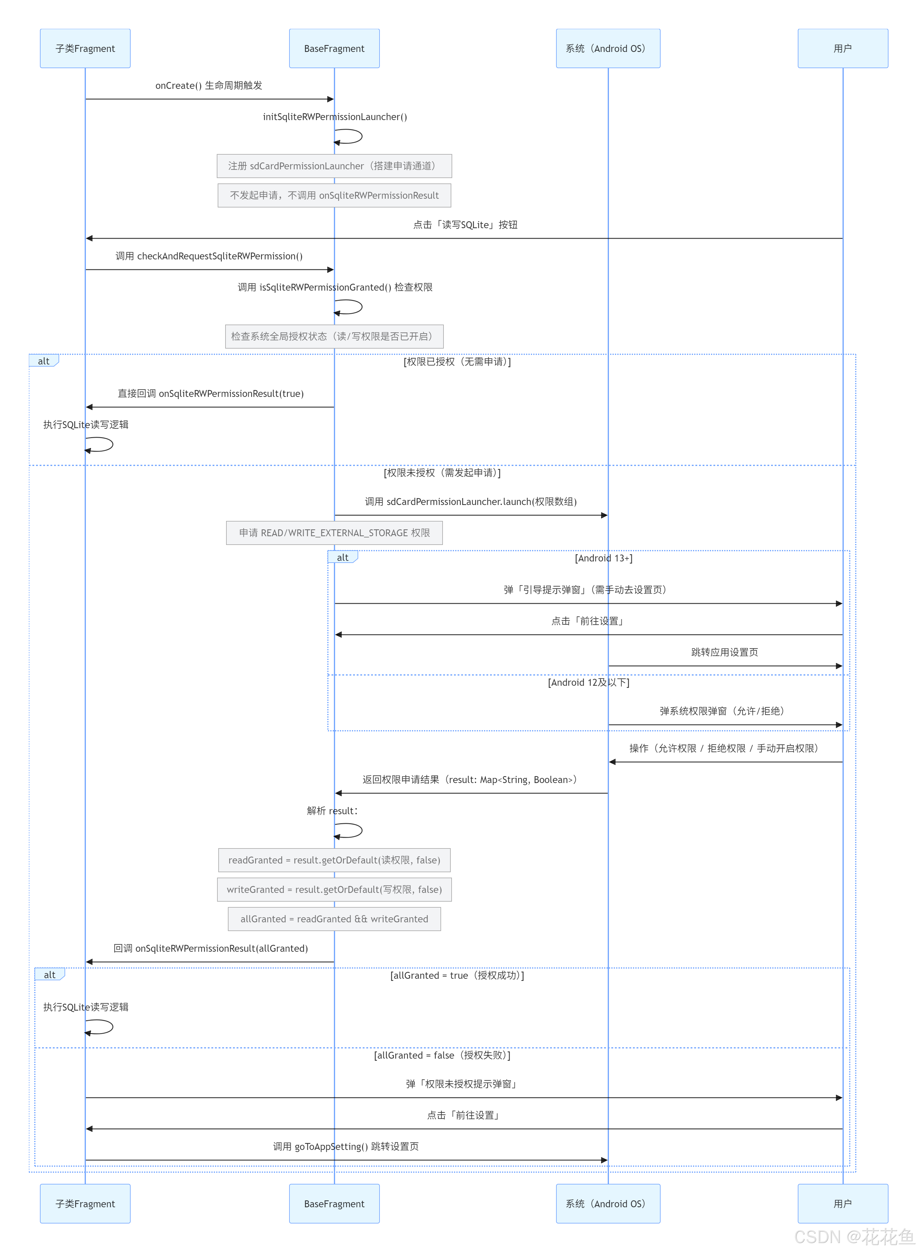 checkAndRequestSqliteRWPermission() 先检查权限: - 已授权 → 直接回调 onSqliteRWPermissionResult(true) → 执行读写数据库; - 未授权 → 发起权限申请(Android 13+弹提示弹窗,低版本弹系统权限弹窗);