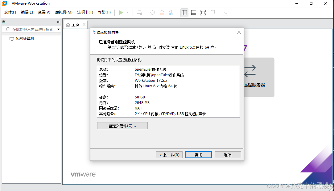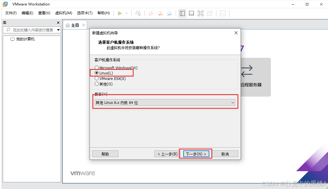 因为我们的openEuler系统是基于Linux内核搞的,所以这里选择的Linux操作系统,版本选择**"其他Linux 6x 内核64位"(最高的Linux版本),点击 "下一步"**