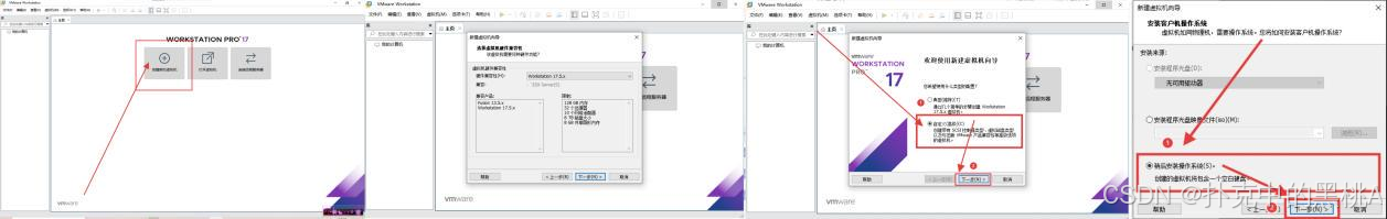打开 VMware Workstation,选择**"自定义(高级)",默认版本, "稍后安装操作系统"**