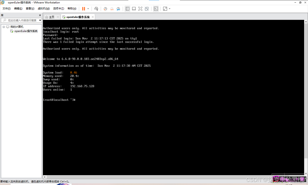 登录系统,输入root账户,输入密码,注意:这里密码会隐藏,成功进入