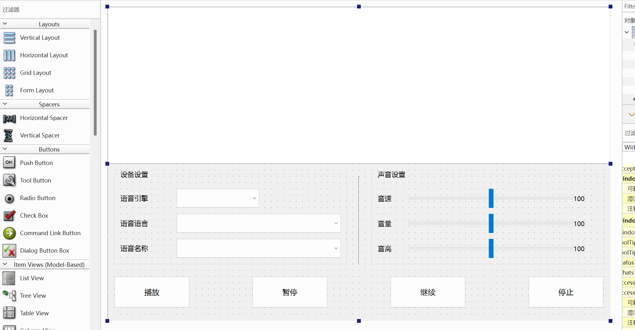 界面上部分用的是文本编辑框可以用来输入要转化为语音的文本,选择左边的控件为Text Edit下面我们选择的是两个Group Box用来将我们的选项进行分组,然后我们选择Label控件并编辑成相应的文字用于对后面的下拉列表选项进行说明,后面的下拉列表选择Combo Box控件该控件可以放入字符串图片的信息供我们进行下拉选择,中间的分割线选择Vertical Line用来显示分割,右边同样先选择Label控件用来说明后面的滑动条信息和数字信息,下面我们选择Push Button控件用来当功能按钮使用。
