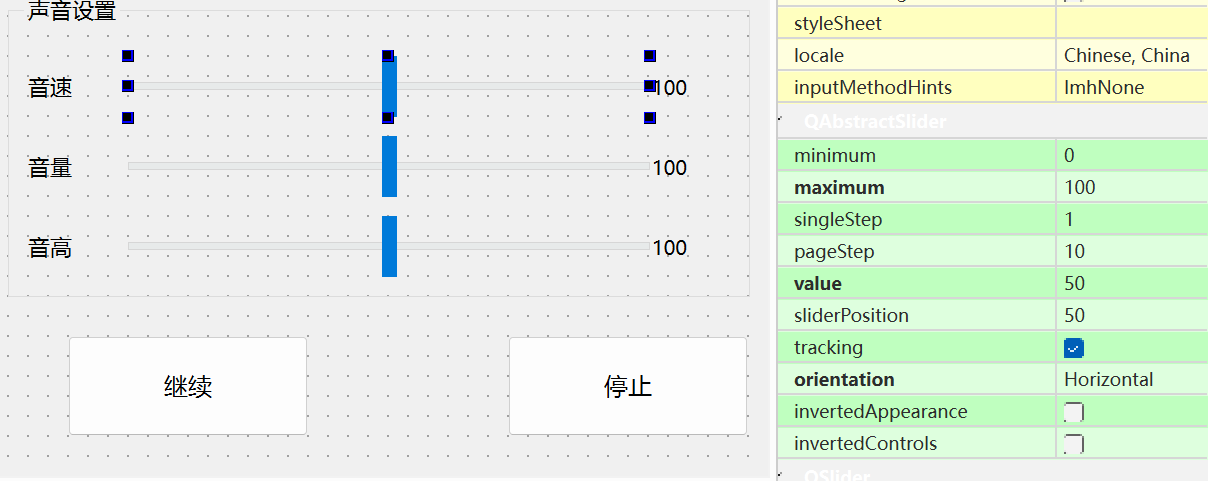 可见该初始化我们在构造函数中进行,首先我们获取到系统所支持的语音引擎链表,然后通过遍历该链表将其中的语音引擎显示出来,并将其添加到对应的comboBox控件中。然后我们定义一个指针用来指向我们创建的QTextToSpeech类对象其中的参数填入this用来指向父对象就是该类,该指针后面可以用于我们来访问此类的方法。最后我们给语音设置的标签设置初始数字,对应将划动条的相关参数也赋值,该参数的调整在我们上一章所讲到的对应类的属性编辑那个栏目进行编辑如下: