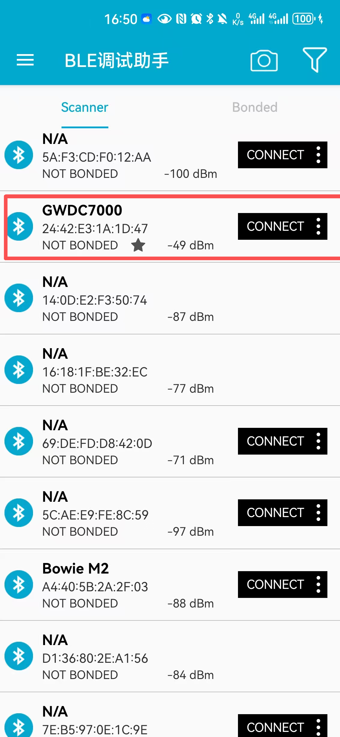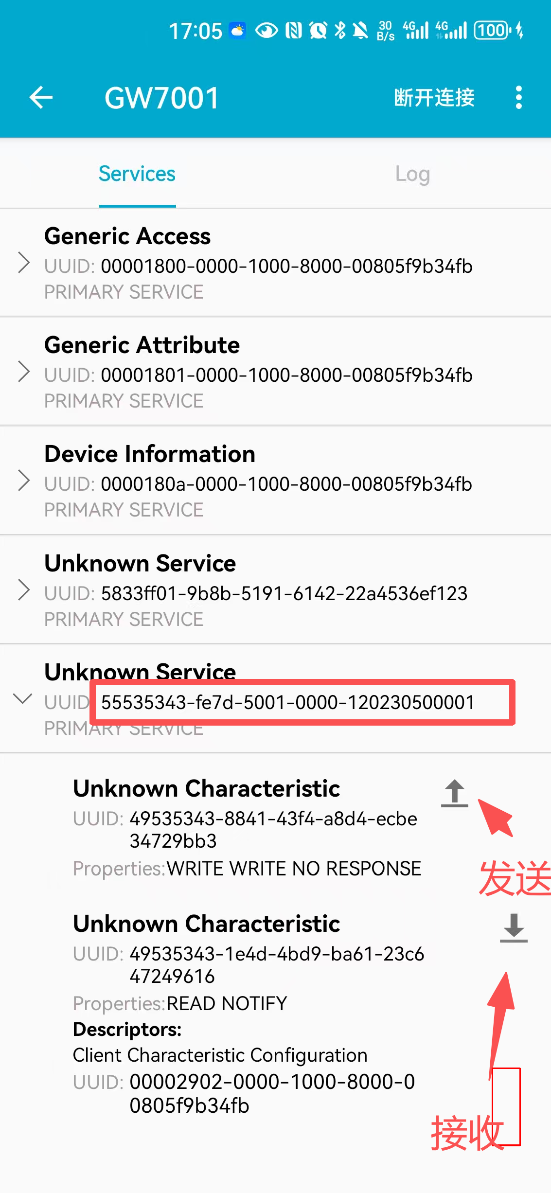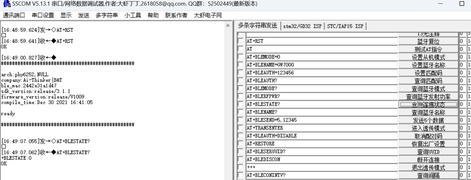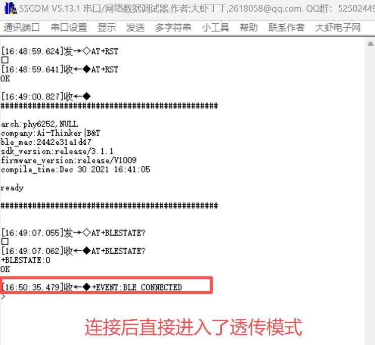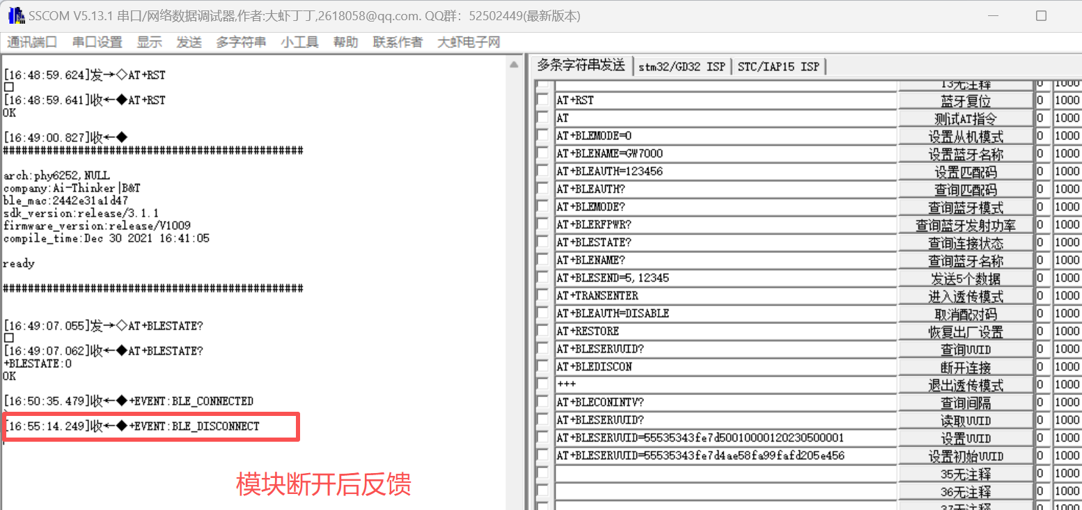 根据我们前面从机命令介绍的反馈,调试助手接收到的连接状态返回,蓝牙模块就进入了连接状态。所以判断连接如下: