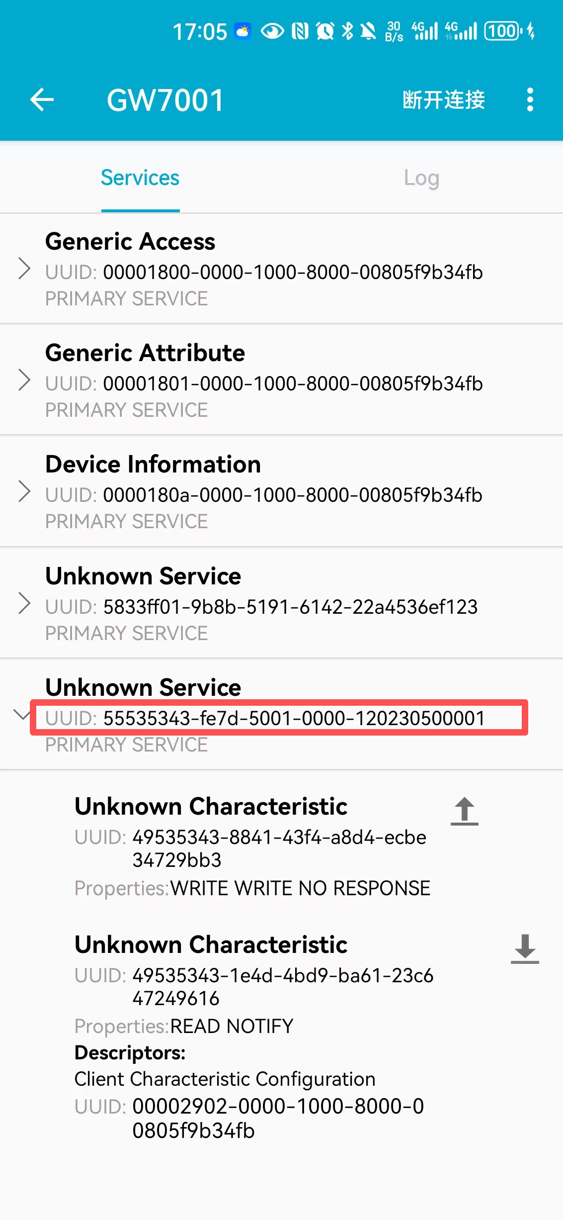 AT+BLESERUUID=55535343fe7d50010000120230500001