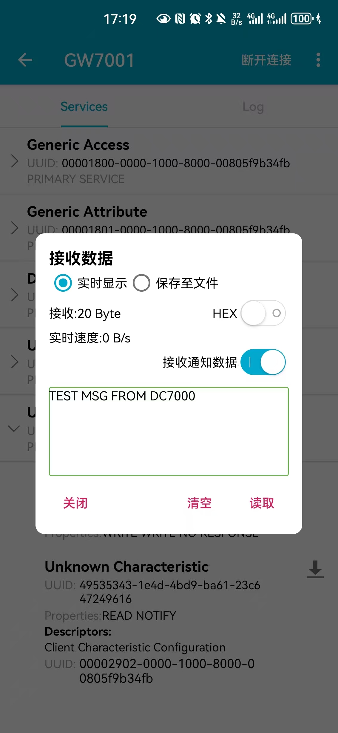 Proto_ble_send((uint8_t*) "TEST MSG FROM DC7000", strlen("TEST MSG FROM DC7000"), 100);