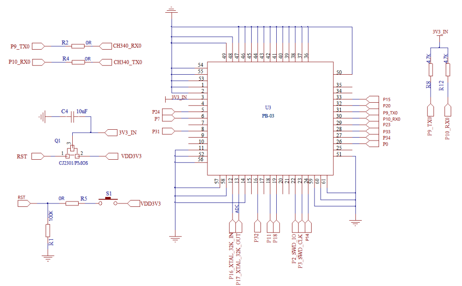 PB-03 模块提供丰富的外设接口,包括 UART,PWM,ADC,I2C,SPIPDM,DMA 和多达 19个 I0 口。