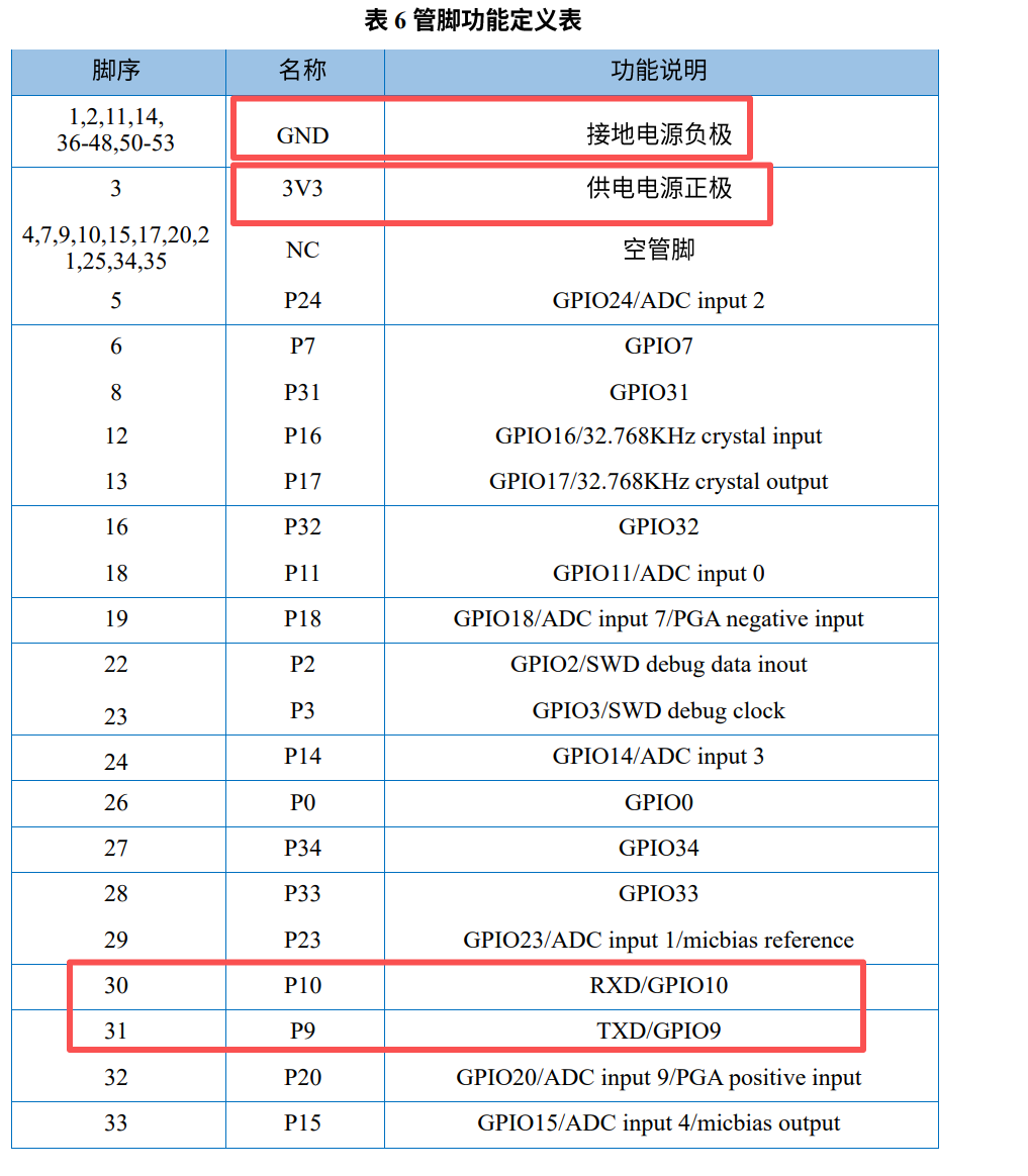 PB-03得管脚功能定义如下图所示,芯片供电3.3V,然后通过串口与MCU进行通信。