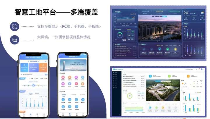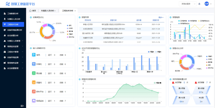 **BI大屏:**以图形可视化的方式,全方位展现工程情况,包括项目、人员、安全、设备、质量、物资、物联等方面,为领导决策提供信息支撑。