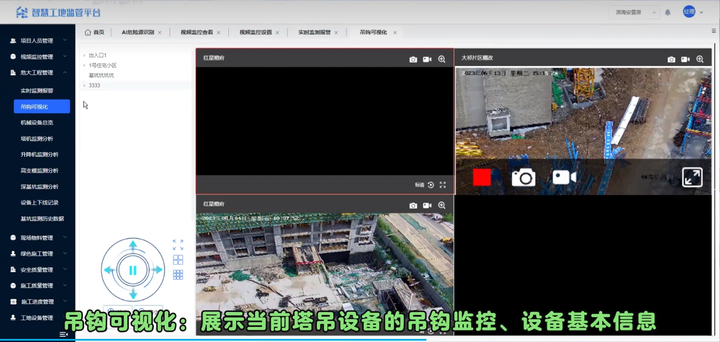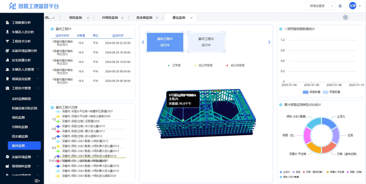 **塔吊监测系统:**在起重臂、铰接点和基座等关键部位安装吊重、力矩等传感器或高清摄像头,用于收集起重机的吊重、倾斜、载荷和位置等数据及吊钩可视化分析。这些数据会通过数据采集装置传输到云平台进行处理和分析。