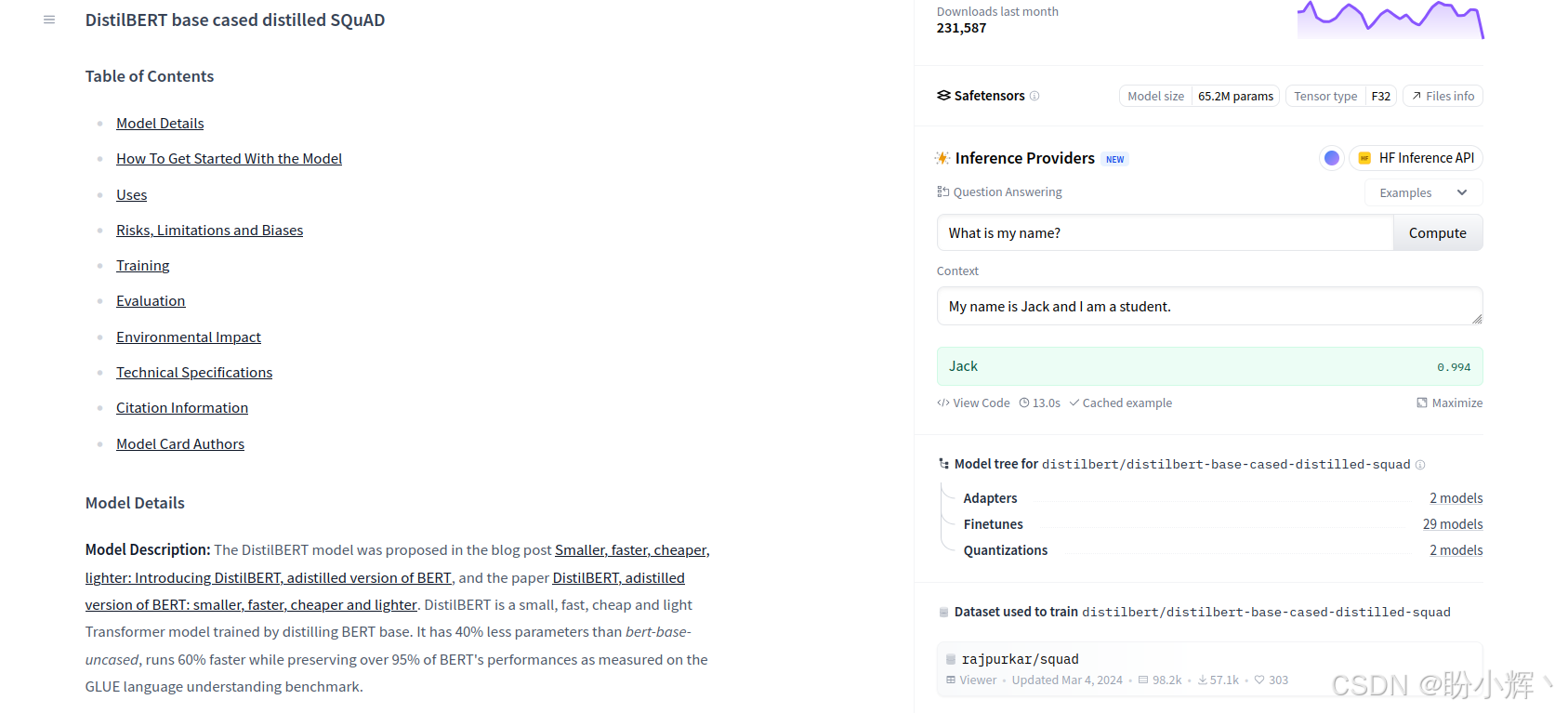 在以下示例中,可以看到一个基于编码器的问答模型,在SQuAD 数据集上进行了微调后的输出: