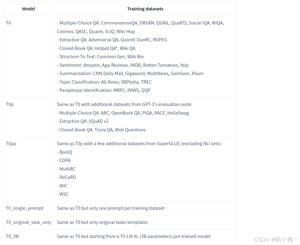 T0 是一系列开源模型,这些模型经过大量任务的训练。下图展示了用于训练这些模型的相关数据集。