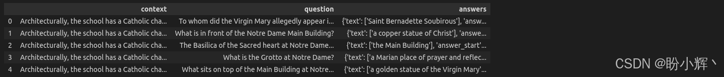 需要注意的是,在以上代码中,我们添加了一个新列 text,将所有内容 (context, question, answer) 重新进行了表述。
