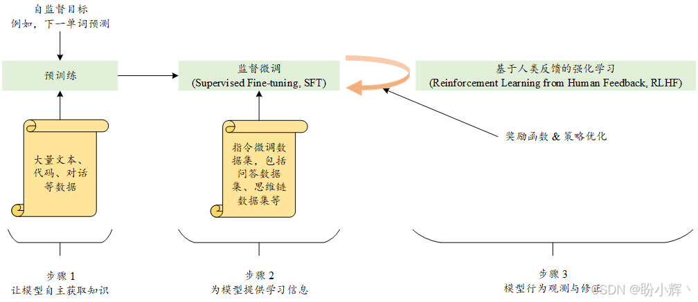 目前,LLM 领域的一个重要趋势是"基于人类反馈的强化学习" (Large Language Model, RLHF)。我们可以将 RLHF 范式的步骤形式化如下: