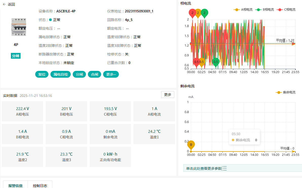 智能断路器可将运行状态、电能数据、事件记录上传至后台,形成完整的配电数据资产:电能消耗实时查看;回路负荷趋势分析;历史事件日志查询,让配电的"黑箱"变成透明管理。