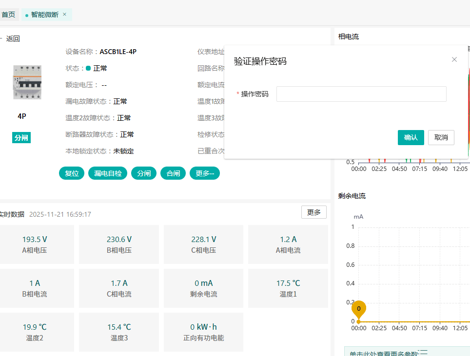 断路器实时监控页面展示设备的运行状态、实时数据、各个电参量的历史曲线、报警信息和控制日志。并支持用户对断路器进行复位、自检、分合闸、检修开关、强制分合闸等操作。