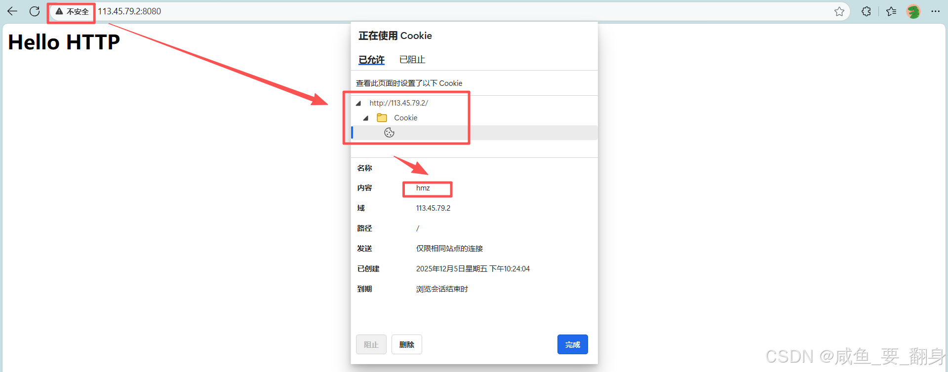 启动服务器后,在浏览器访问服务端时即可查看到我们设置的"hmz"cookie值,此时该cookie已成功写入浏览器。