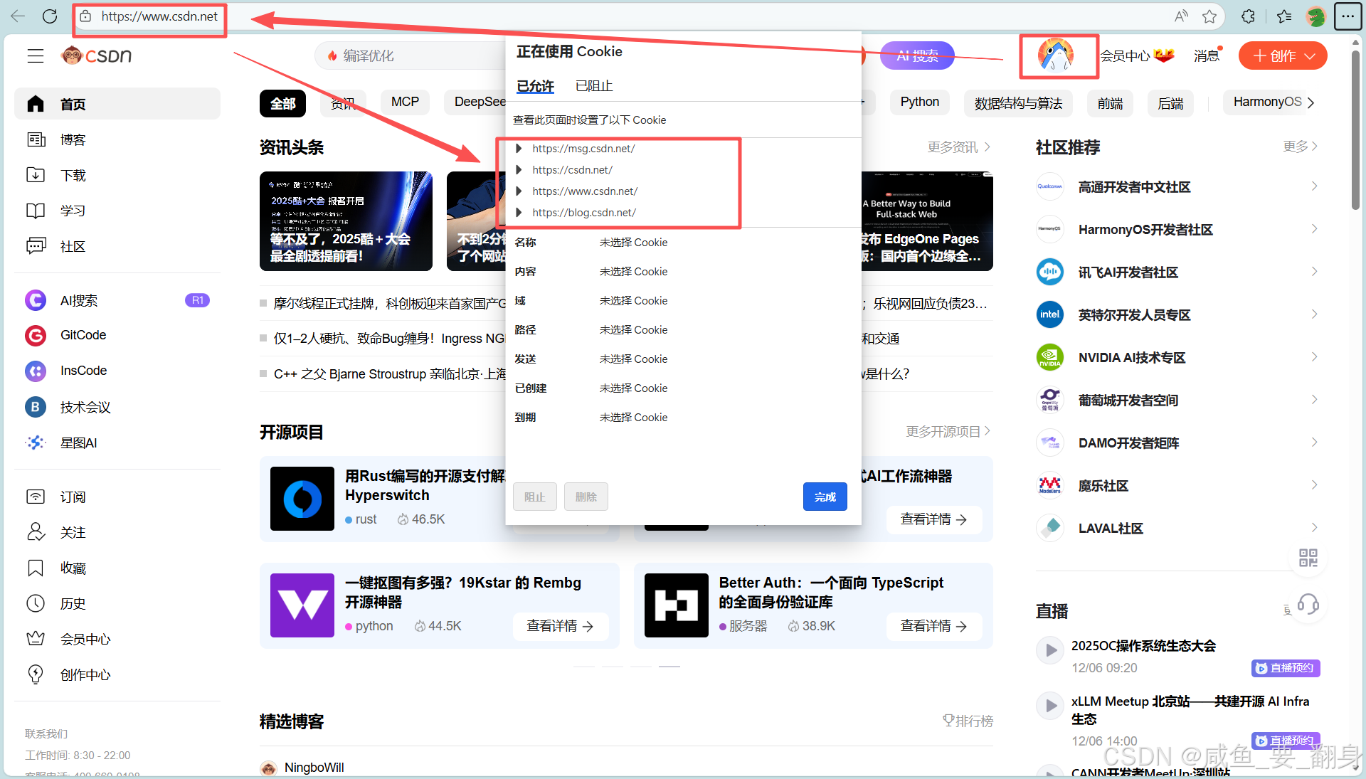 **示例:**登录CSDN后,关闭浏览器再打开,无需重新输入账号密码,这其实是利用Cookie技术实现的。只需点击浏览器地址栏的锁形图标,即可查看该网站存储的所有Cookie数据。如下: