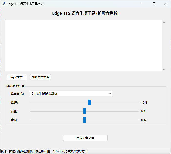 status_var = tk.StringVar(value="就绪 | 扩展音色库已加载 | 语速默认值:10% | 支持中文/英文/方言")