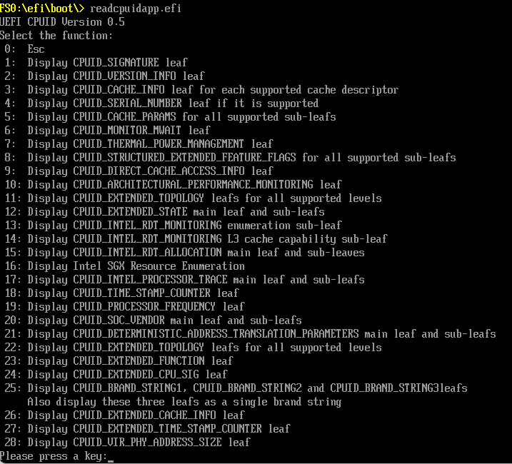 Print(L" 23: Display CPUID_EXTENDED_FUNCTION leaf\n");