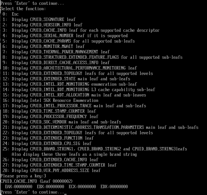 Print(L" 26: Display CPUID_EXTENDED_CACHE_INFO leaf\n");