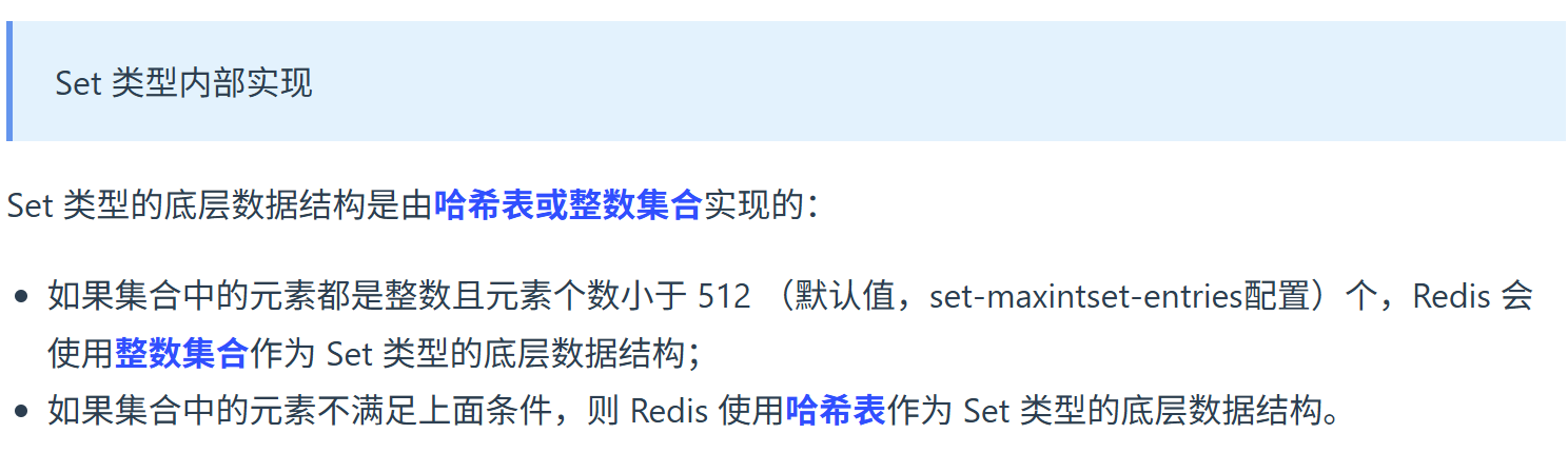 | Set 集合 | 包含字符串的无序集合 | 字符串的集合,包含基础的方法有查看是否存在添加、获取、删除;还包含计算交集、并集、差集等 |