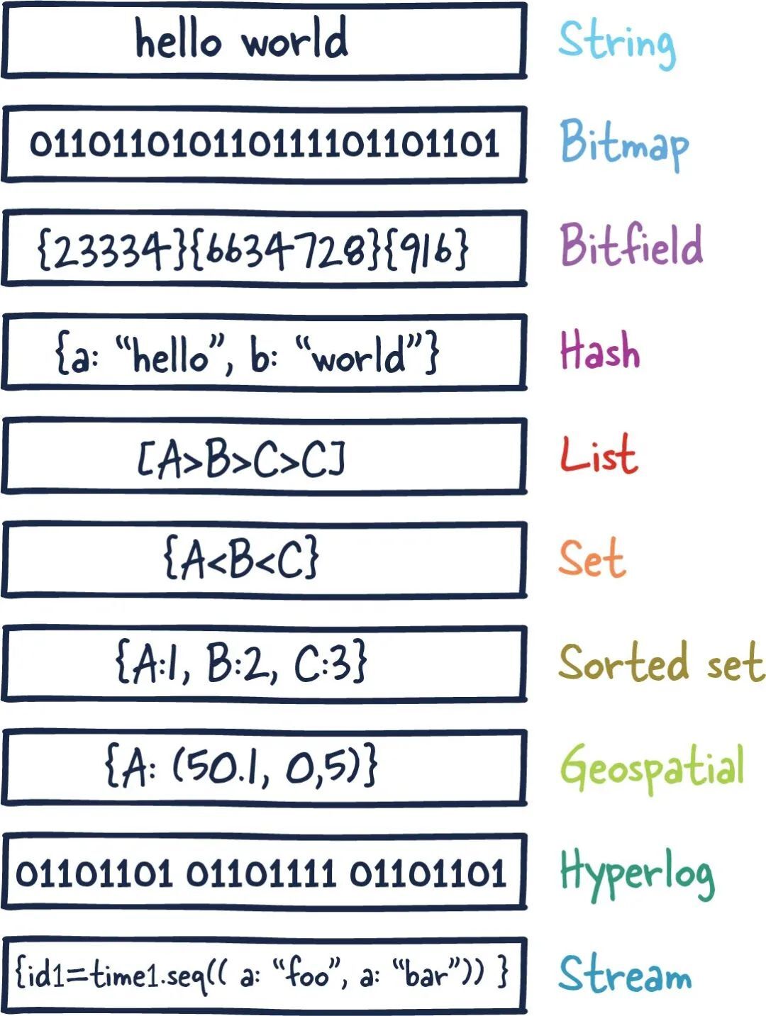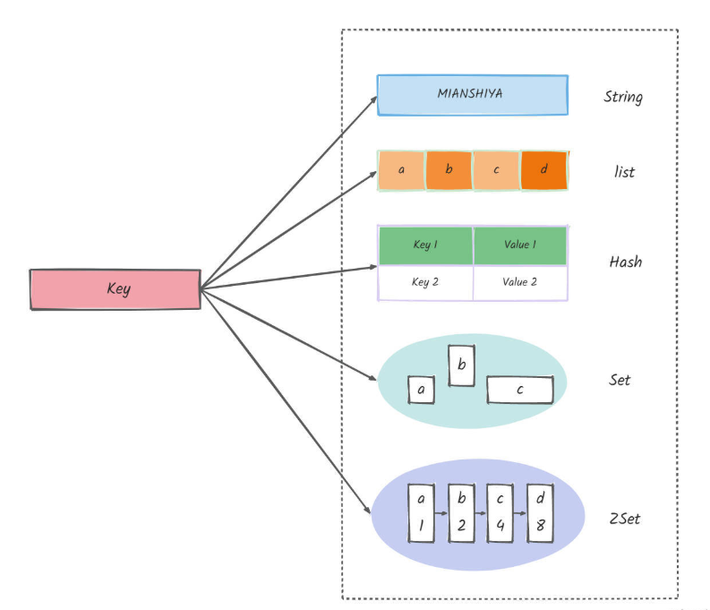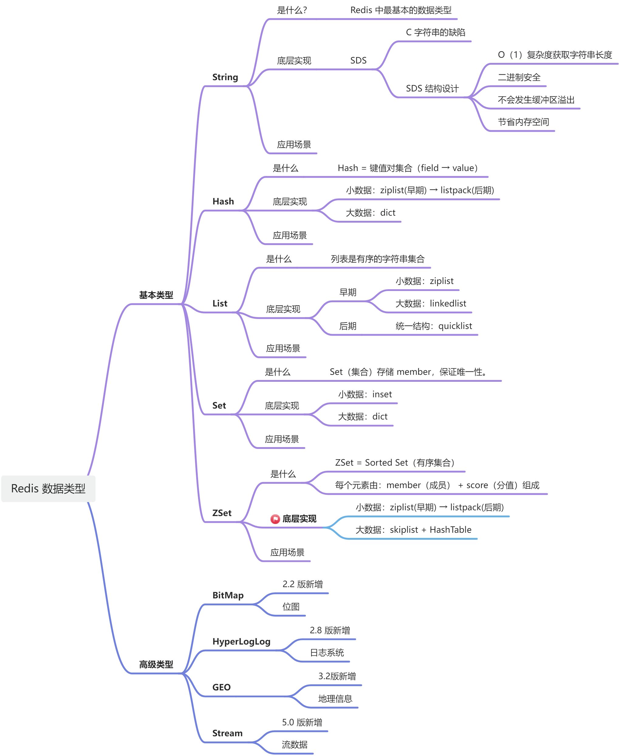 提示:Redis 有 5 种基本类型 和 4 种高级类型,面试能回答出五种常见的基本类型就可以,其他新的数据类型则需学习。