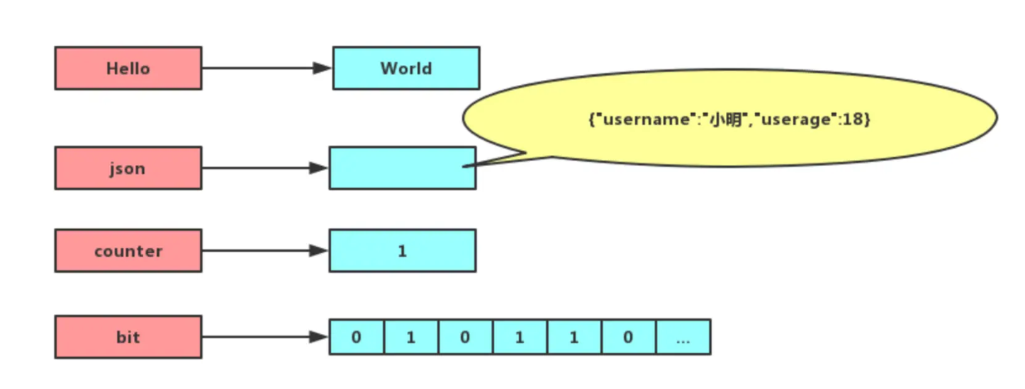 key 是唯一标识,value 是具体的值,value 可以存储任意类型的数据,比如文本、数字和二进制数据,value 的最大长度为512MB。