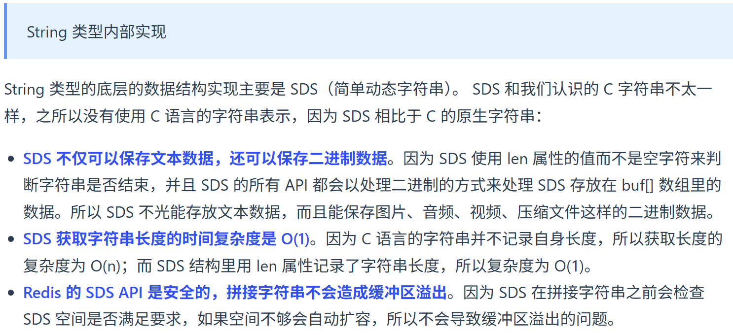 - String 使用 SDS 实现,是动态可扩展的二进制安全字符串。