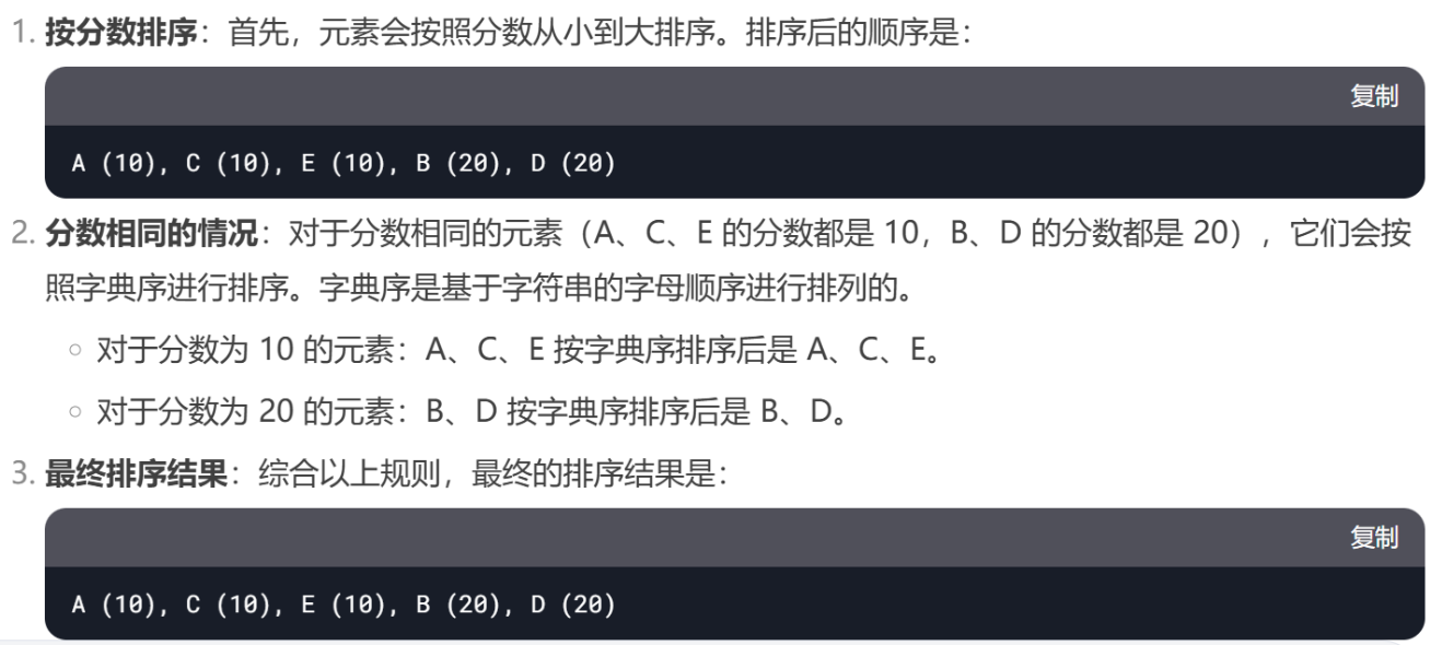 | Skiplist(跳表) | 按 score 排序,支持范围查询 O(logN) |