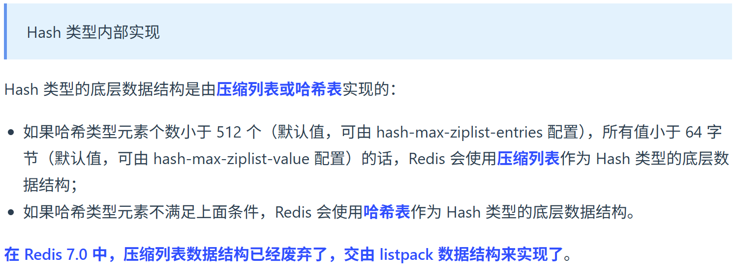 - Hash 小数据时使用 listpack(旧版本 ziplist),大时使用哈希表 dict。