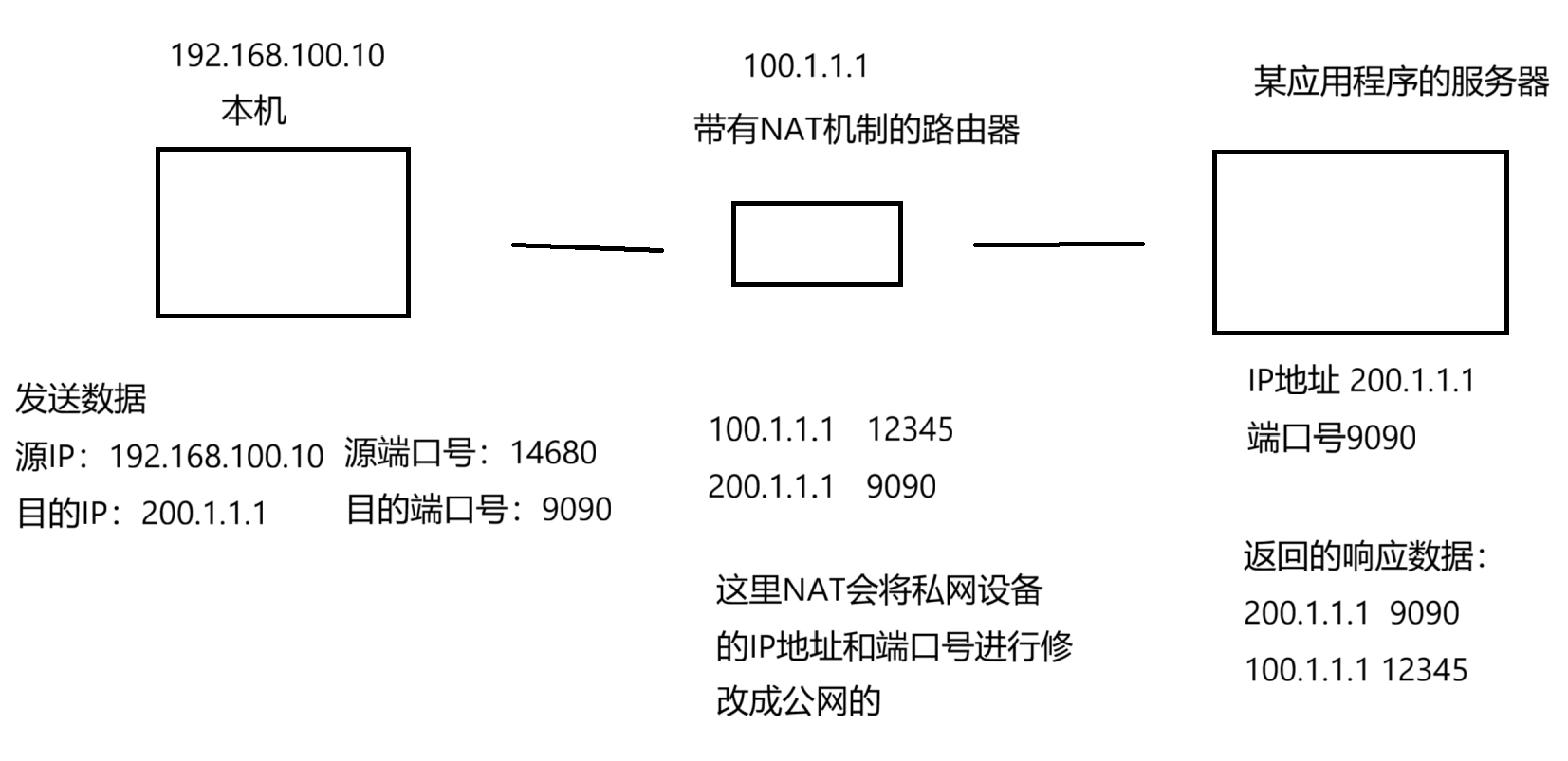 当私网发送的数据经过公网路由器时候,会把数据里面的IP地址和端口号换成该路由器的,再发送出去,路由器接收到数据后会将数据里面的自己的IP地址和端口号换成之前的,发送给私网的机器。