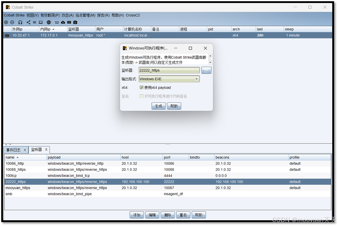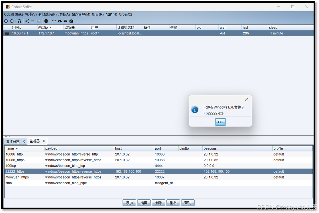 基于 22222_https 监听生成 HTTPS Beacon 可执行文件,命名为 22222.exe。这个木马的功能运行后会主动连接 192.168.100.100:22222(跳板机内网地址)。