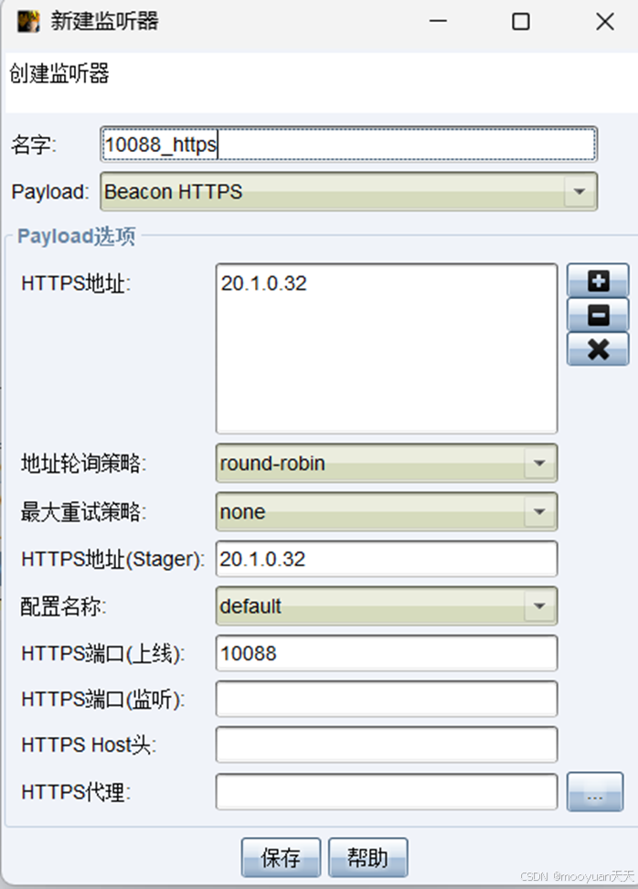 攻击机创建监听器 10086_https(20.1.0.47:10088),等待跳板机转发流量。