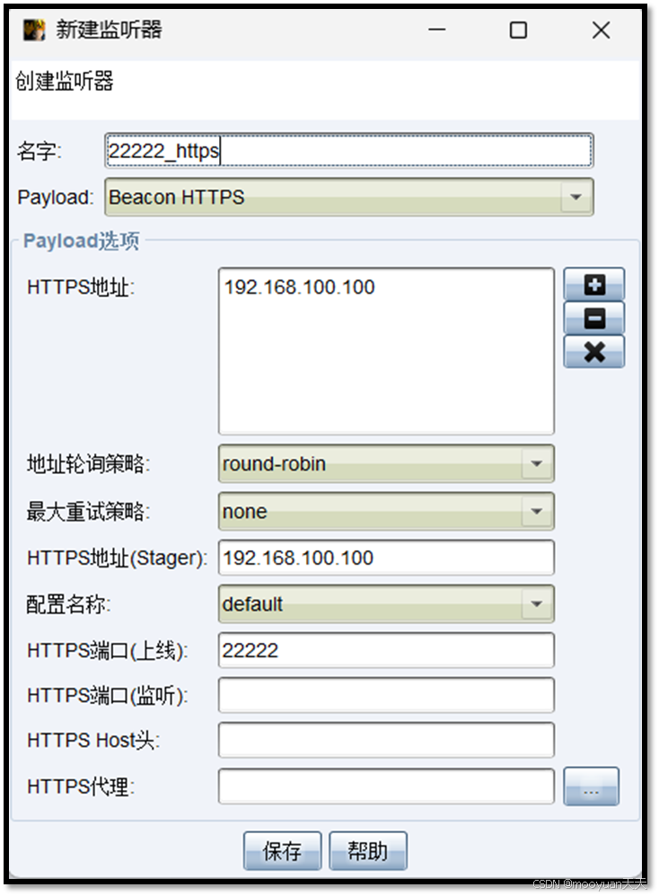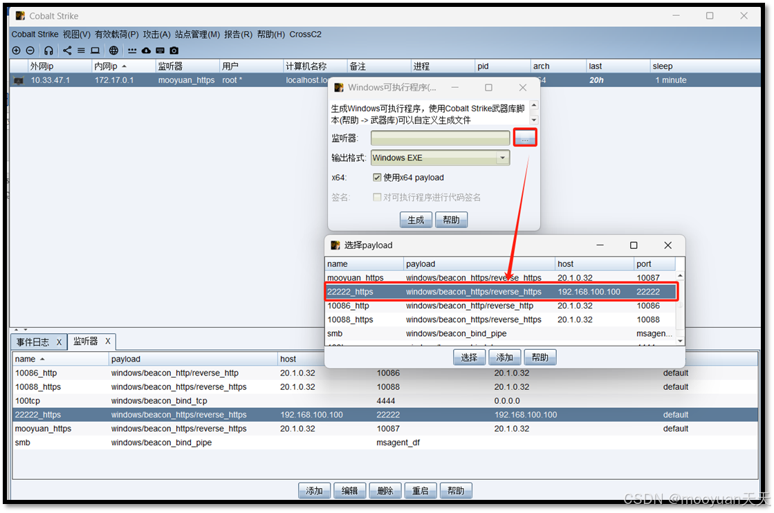 攻击机创建内网HTTPS Beacon(用于内网主机连接跳板机),故而监听的ip地址为跳板机的内网ip地址192.168.100.100,端口设置为22222。创建好监听后基于此生成Payload命名为22222.exe。