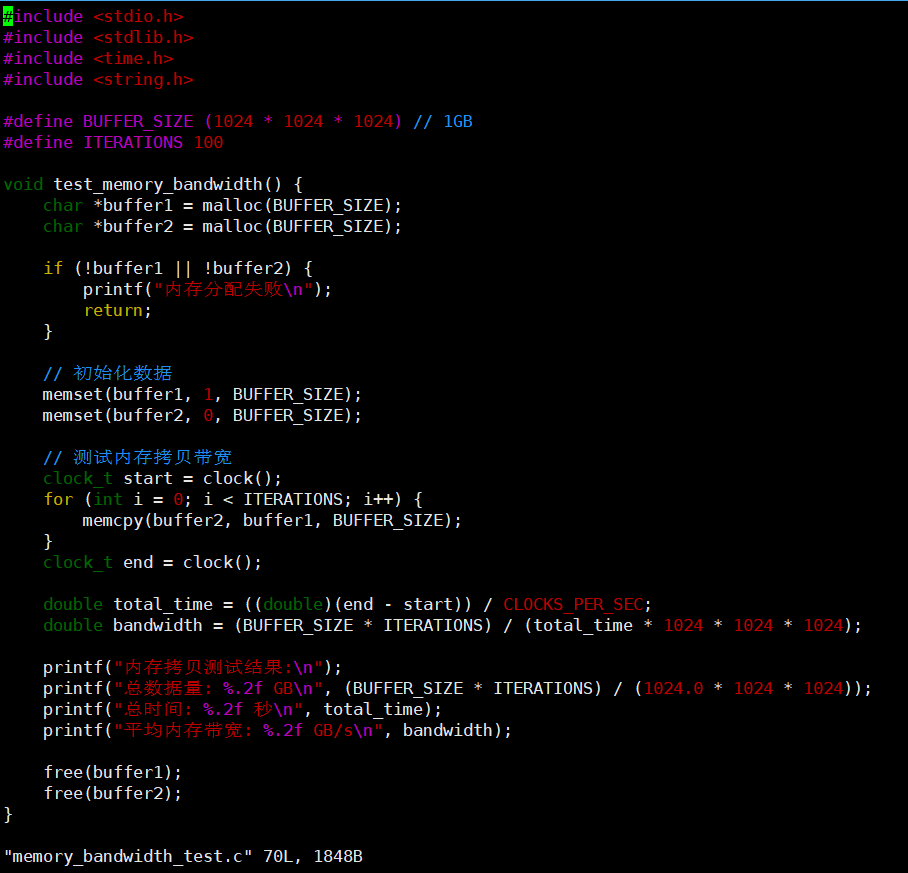 6. 创建测试脚本:新建 memory_bandwidth_test.c 文件,复制以下代码: