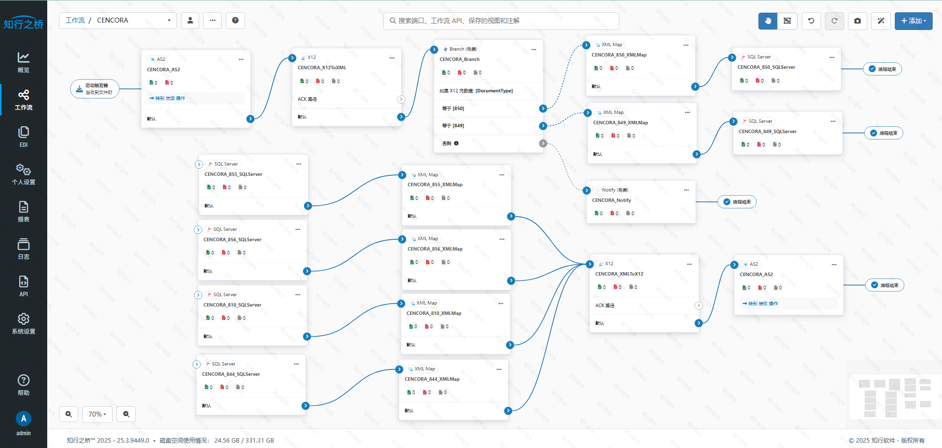 完成以上准备工作后,即可在知行之桥 EDI 系统中搭建对应的工作流,下面展示了基于此系统与 Cencora 对接的典型工作流示例(以AS2传输协议,中间数据库方案为例),并通过 SQL Server 实现与 ERP 系统的无缝集成: