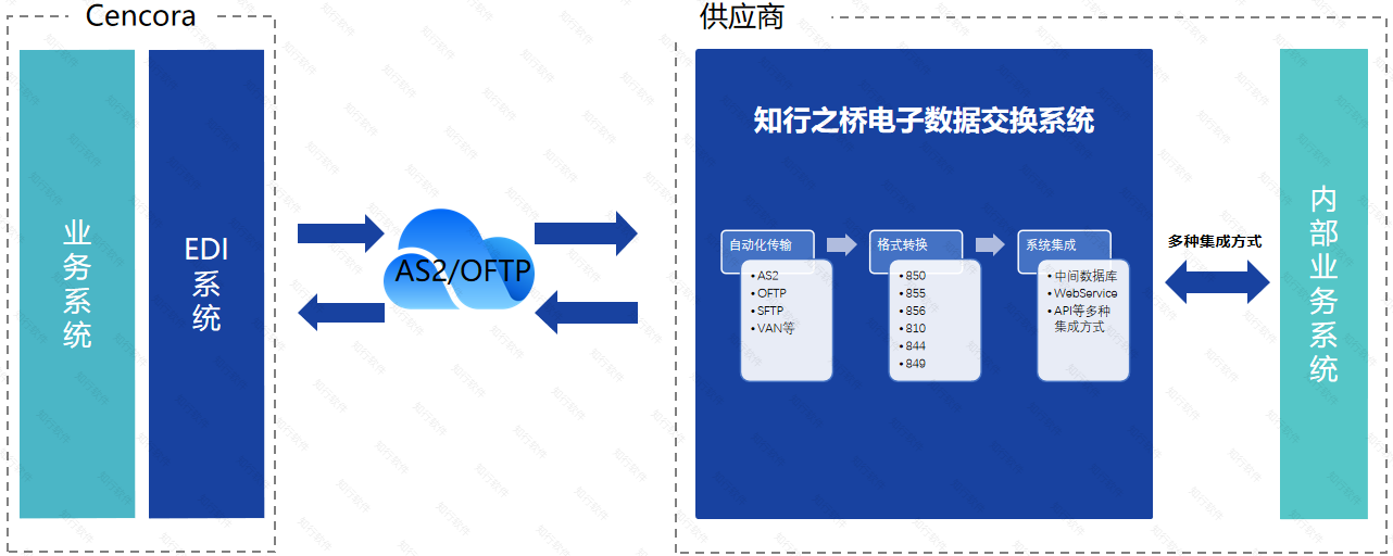 EDI传输协议:常见的传输协议包括AS2、OFTP以及VAN,供应商对接Cencora的EDI项目中使用哪种传输协议需要以Cencora提供的EDI连接信息为准。知行之桥EDI系统内置多种MFT功能模块,支持通过不同传输协议与交易伙伴搭建EDI连接通道。