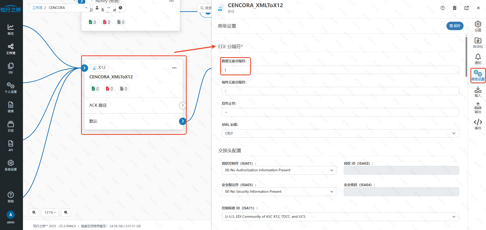 需要根据Cencora提供的EDI示例报文,单独配置数据元素分隔符。可在X12端口的高级设置选项卡下,找到EDI分隔符,然后在数据元素分隔符中进行配置,如下所示: