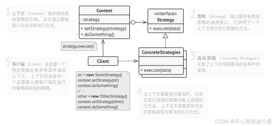 - 具体策略(ConcreteStrategy)类:实现了策略接口的具体算法。