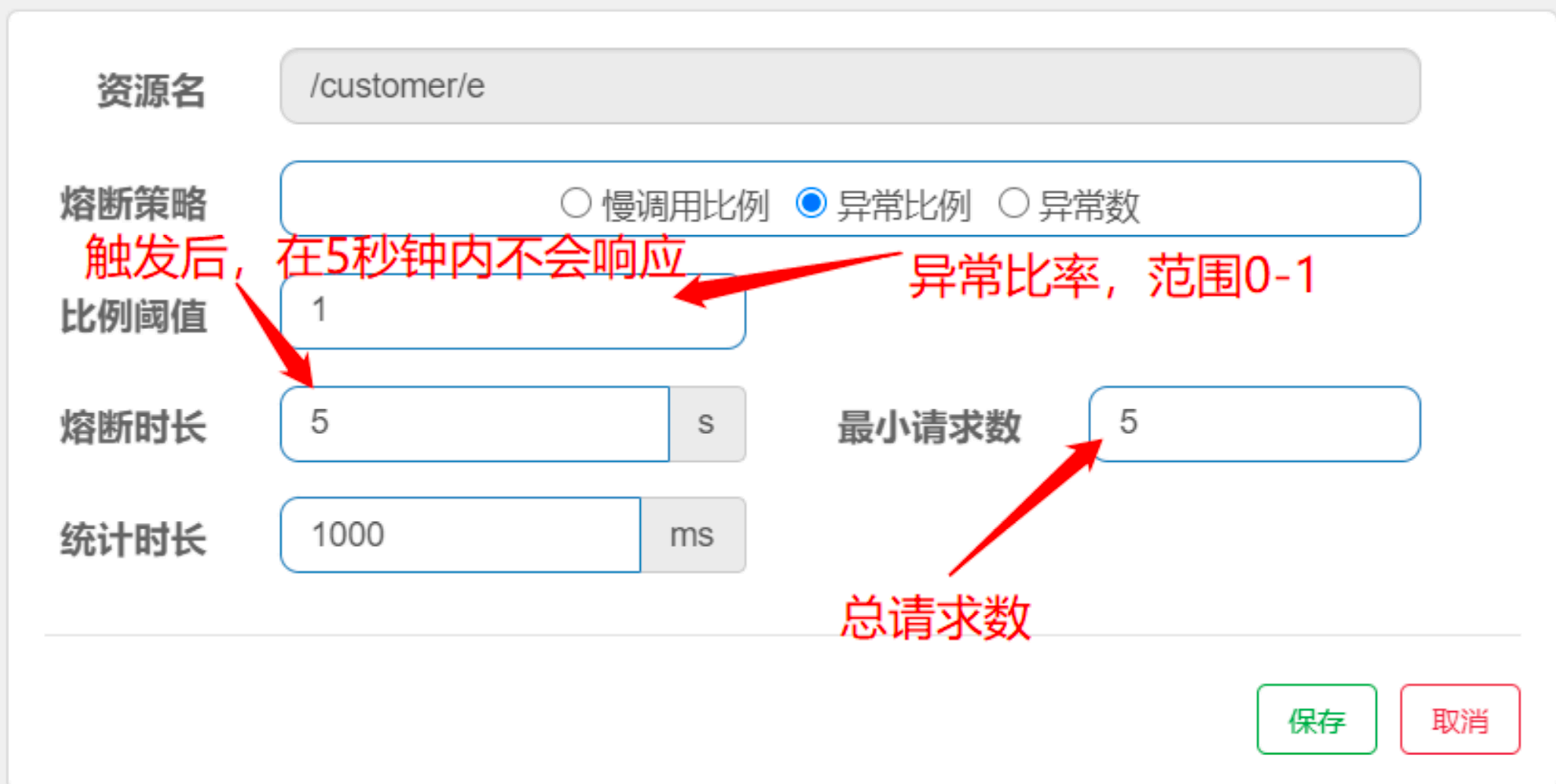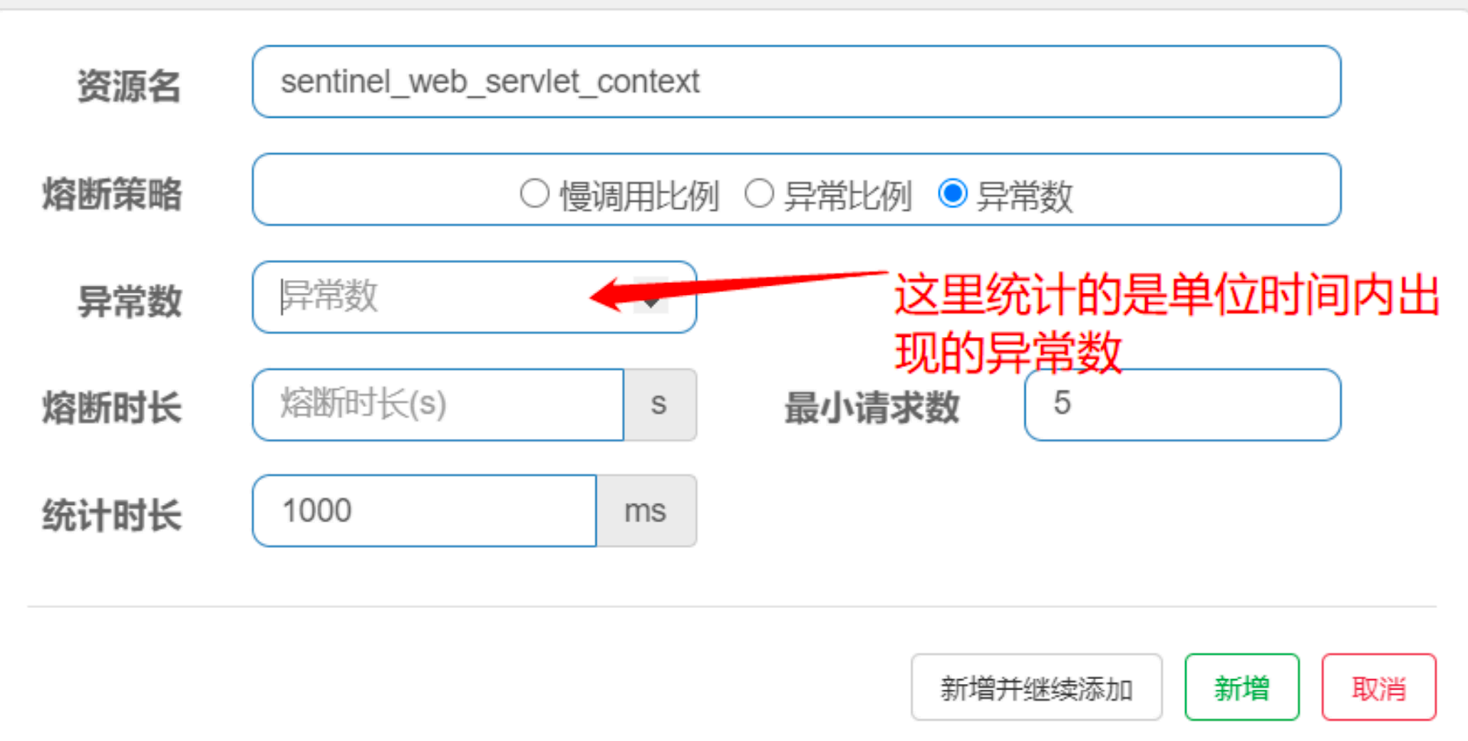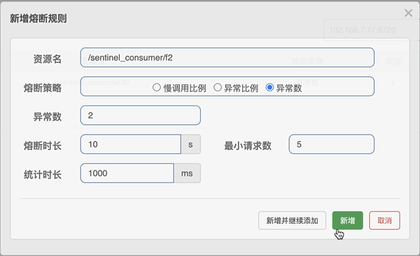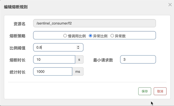 - 异常数:当资源近统计时⻓的异常数⽬超过阈值(异常数)之后会进⾏服务降级